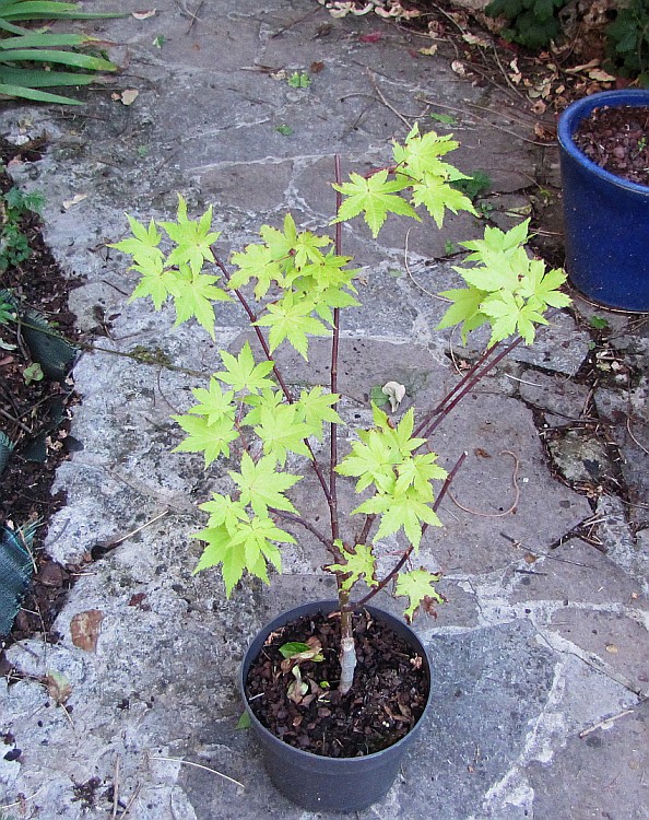 Arbre greffé, forcé sous serre : longs entre-noeuds, couleur inintéressante. Je l'ai donc taillé drastiquement cet automne, et il commence à ressembler à quelque chose.