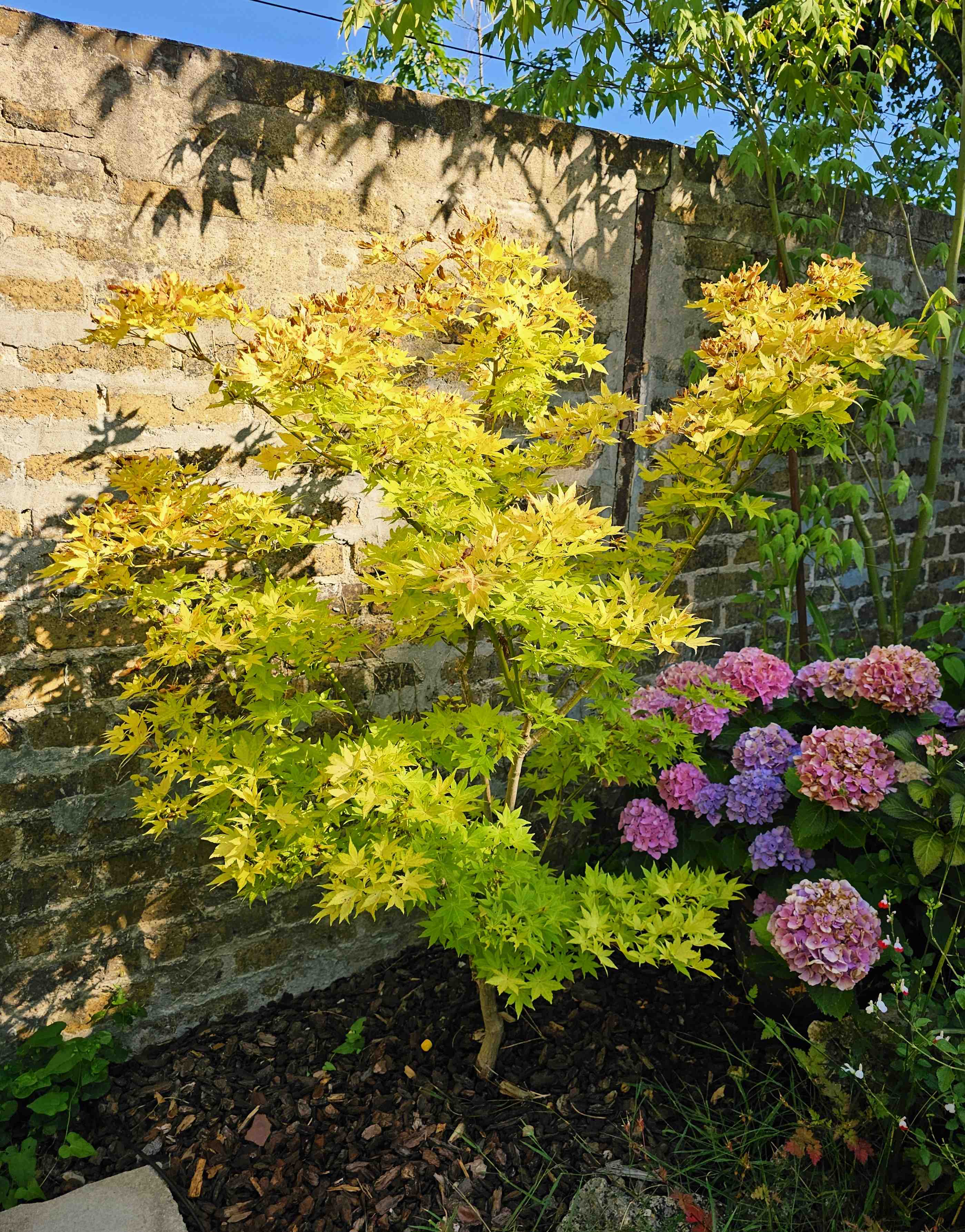 C'est le petit, avec des feuilles plus "amoenum" que celui qui est dans le fond, et dont les feuilles sont beaucoup plus "or", un 'Orange Dream' (petite marcotte ou bouture, je ne me souviens pas) Juin 22 et mai 23 :