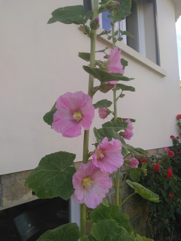 Et ce qui fut autrefois, en des temps reculés, un séchoir à linge, et qui est devenu au fil des ans une plantation de roses trémières. C'est quand même plus joli que des vieux torchons troués, même si ces roses trémières, je ne les ai pas plantées !