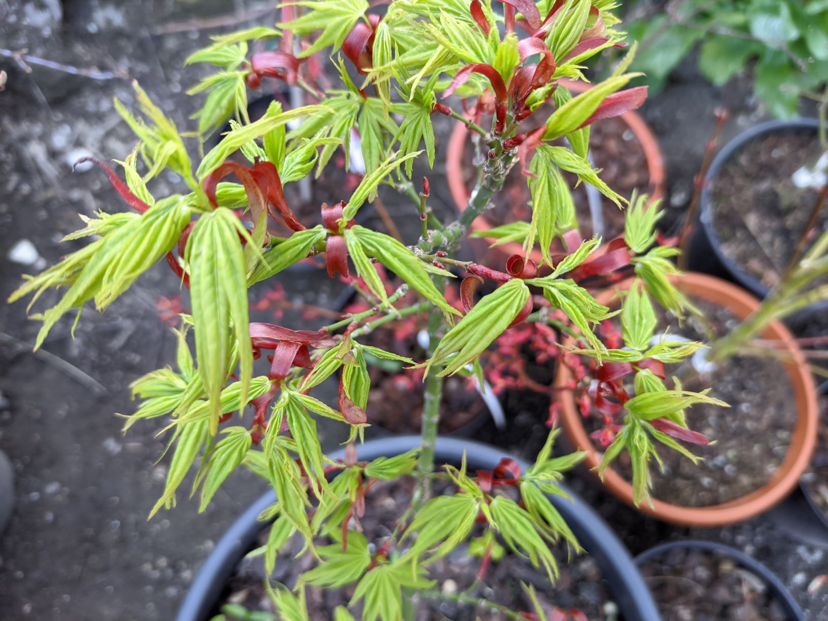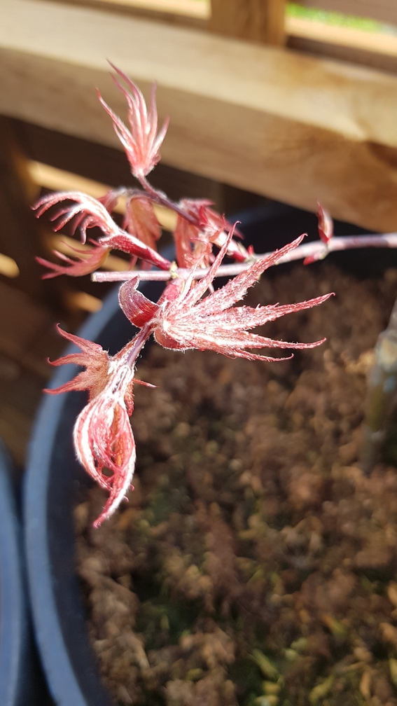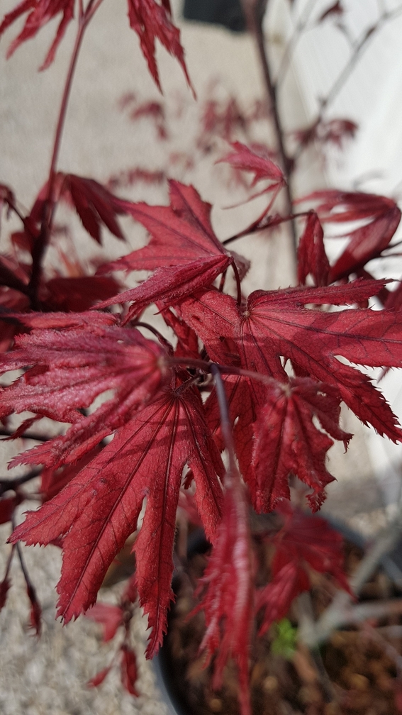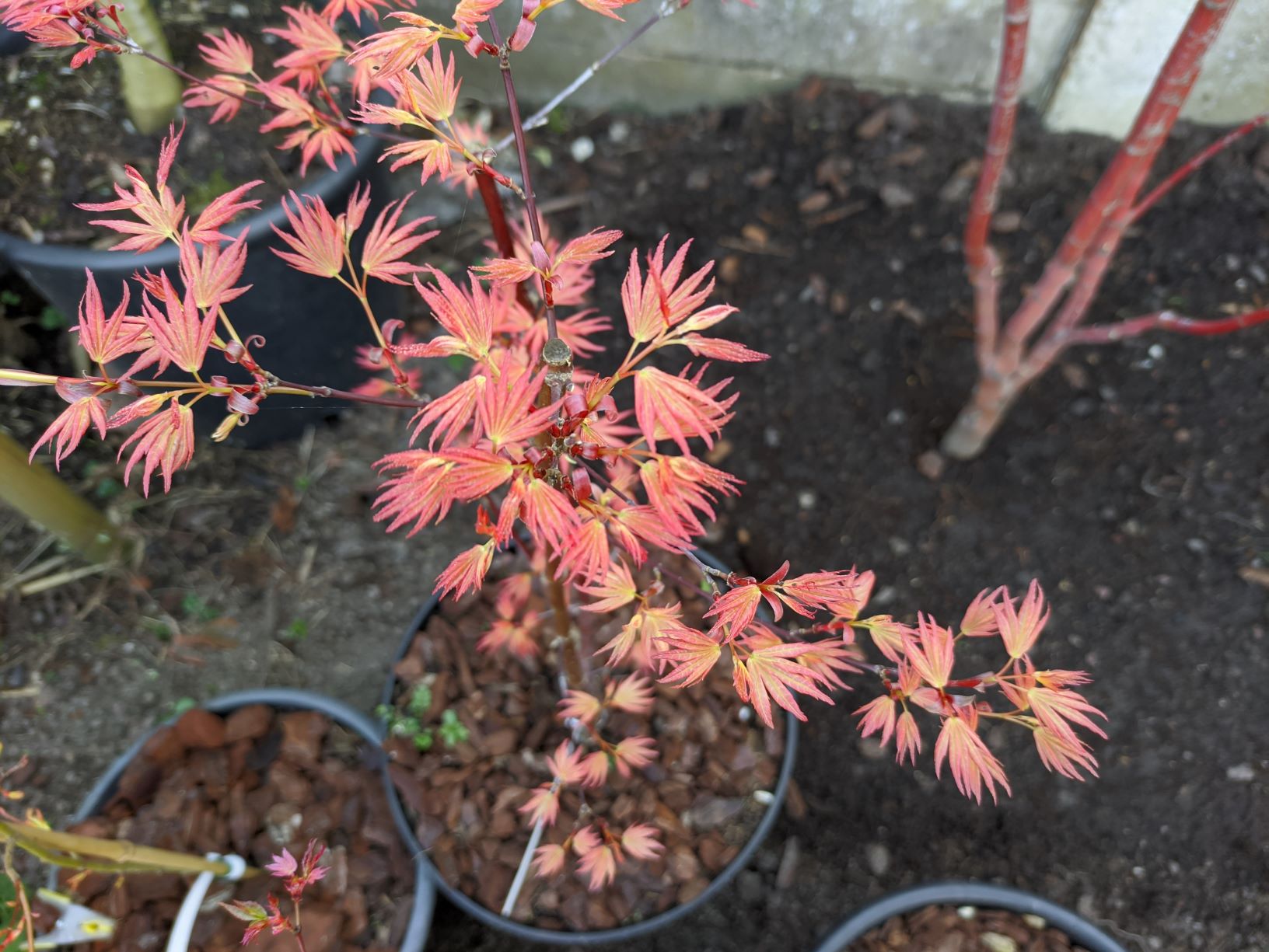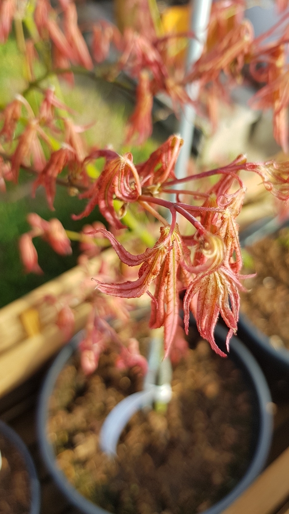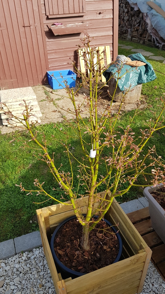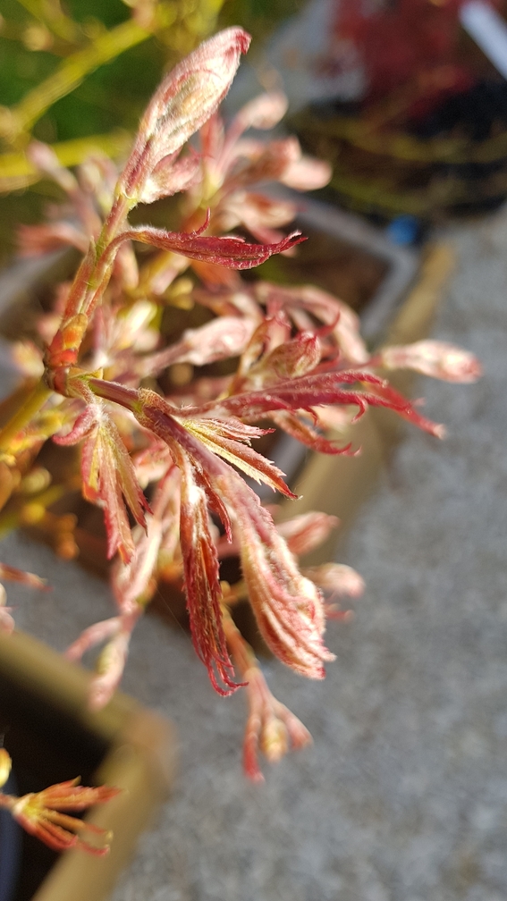 @ POPMACKENZY : De bien beaux spécimens que tu nous présentes là ! Je " bave " sur ton 'amagi shigure' et ton ' Olsens Frosted Strawberry' : ils sont de belle taille, les miens sont plus petits ! Je les ai mis en terre, en lisière d'un couvert végétal, c'est mieux pour leur croissance, car ces deux cultivars sont très sensibles à la fraicheur racinaire, mais ils ont besoin malgré tout de lumière pour développer leurs racines. La pleine terre est donc ce qui leur convient le mieux, car la croissance racinaire permet d'alimenter les feuilles, qui ne sèchent pas, et l'arbre accroît chaque année sa biomasse, source des réserves, et le cycle recommence... Je l'ai faite courte. Par contre, comme je le craignais, Météo France annonce des gelées matinales en milieu de semaine et malheureusement 'amagi shigure' à complètement débourré...