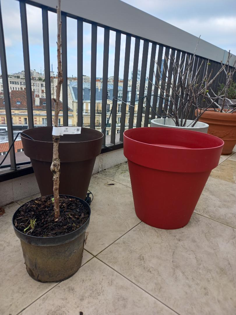 Je vais donc le rempoter dès que possible. J'ai le choix entre 2 pots, le rouge ou le brun, plus petit. Est-ce que le brun conviendra mieux? Le rouge est trop grand?