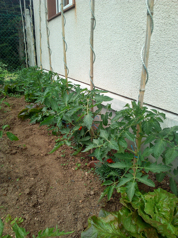 Tes tomates devant le mur sont très belles. J'avais déjà vu faire cette plantation avec succès, la chaleur du mur était restituée la nuit. J'ai tenté de le faire mais ce ne devait pas être la bonne orientation, les plants ont poussé trop en hauteur et les tomates avaient des brûlures