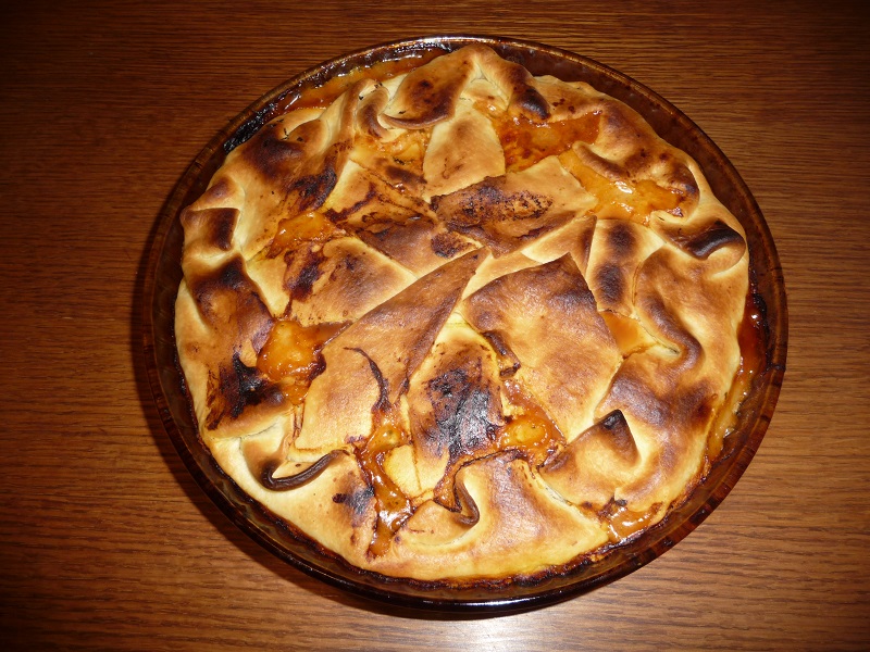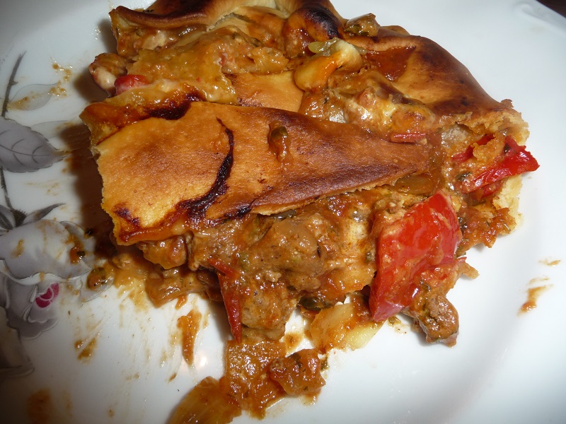On mange la tourte Marcellini :sauce tomate maison , poivrons , oignons , viande hachée de bœuf , tranches fines de fromage , basilic , aîl , poivre moulu ,huile d'olive .