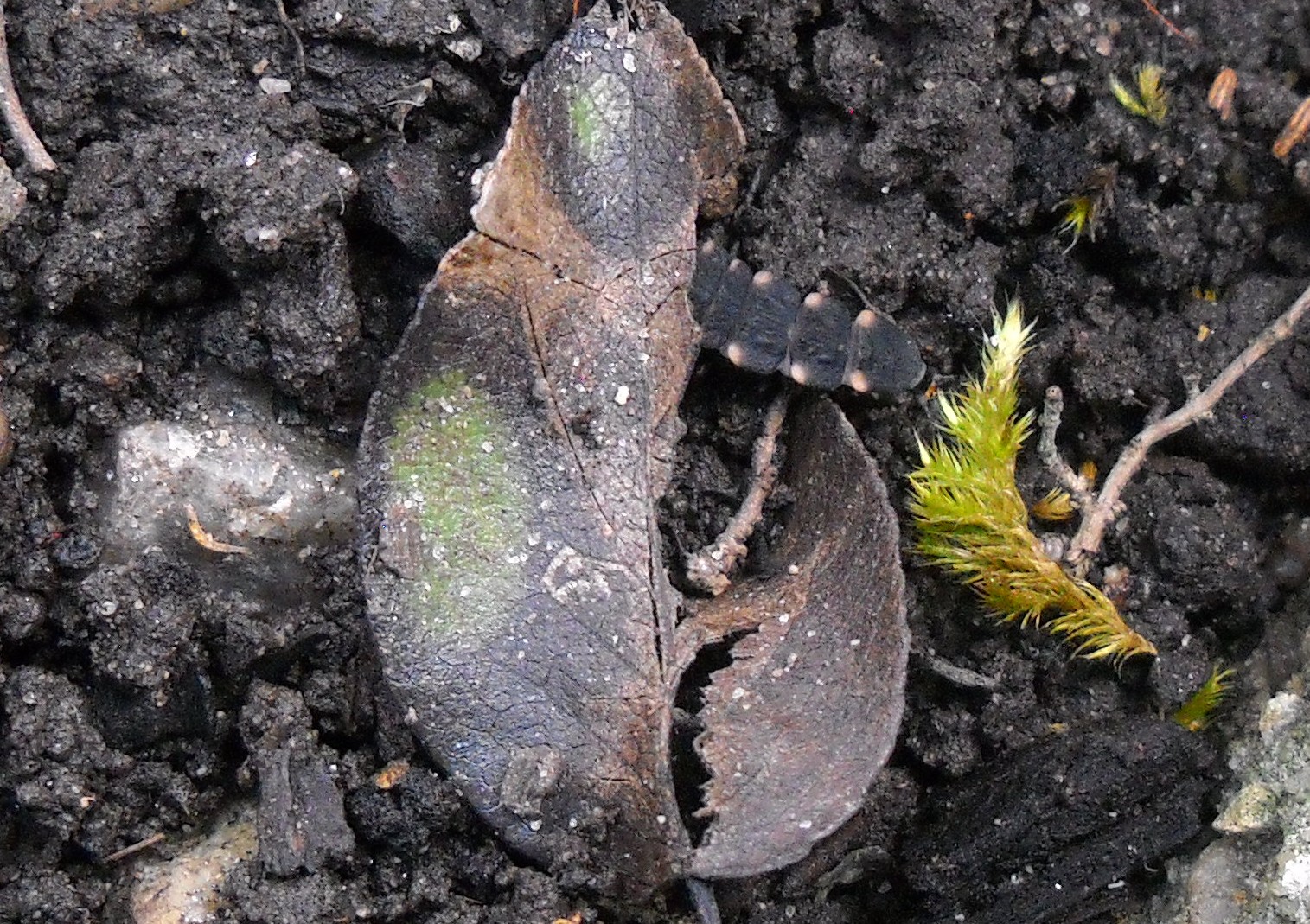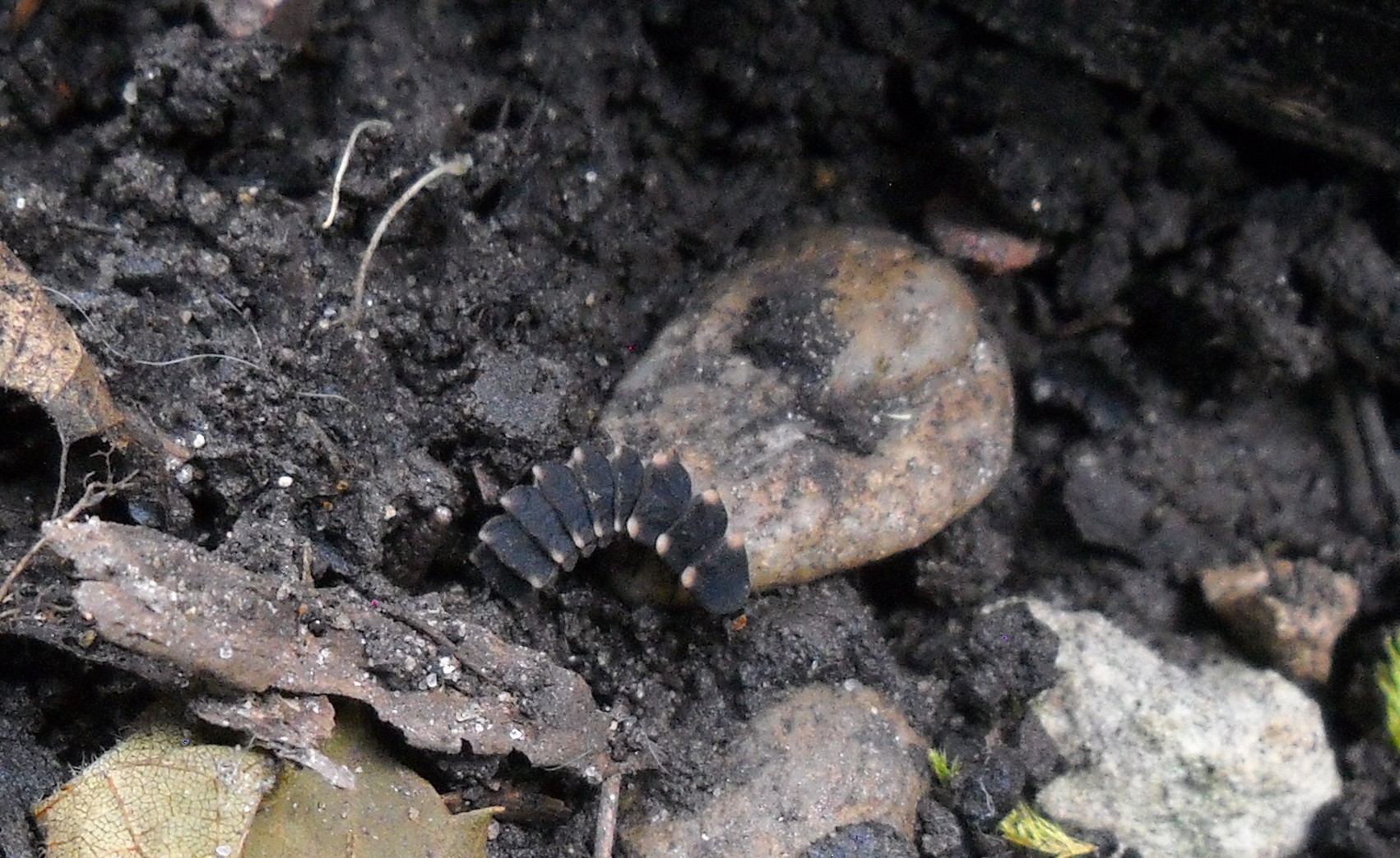 Je vous présente ce Lampyre juvénile, près d’un petit galet puis d’une feuille pour que vous puissiez comparer taille et couleur de ses taches semblant si ternes