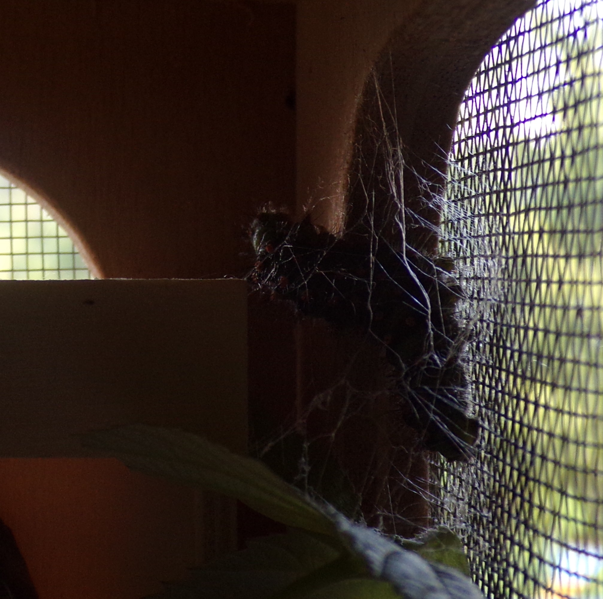 je reprends à partir du dernier jour de sa dernière mue : celui durant lequel elle se vide avant d’entamer le laborieux tressage de soie . Cela remonte au 7 Juin (5 mailles =1cm) je me souviens avoir entendu le bruit des fils de grillage résonner comme quand on pince une corde de guitare !
