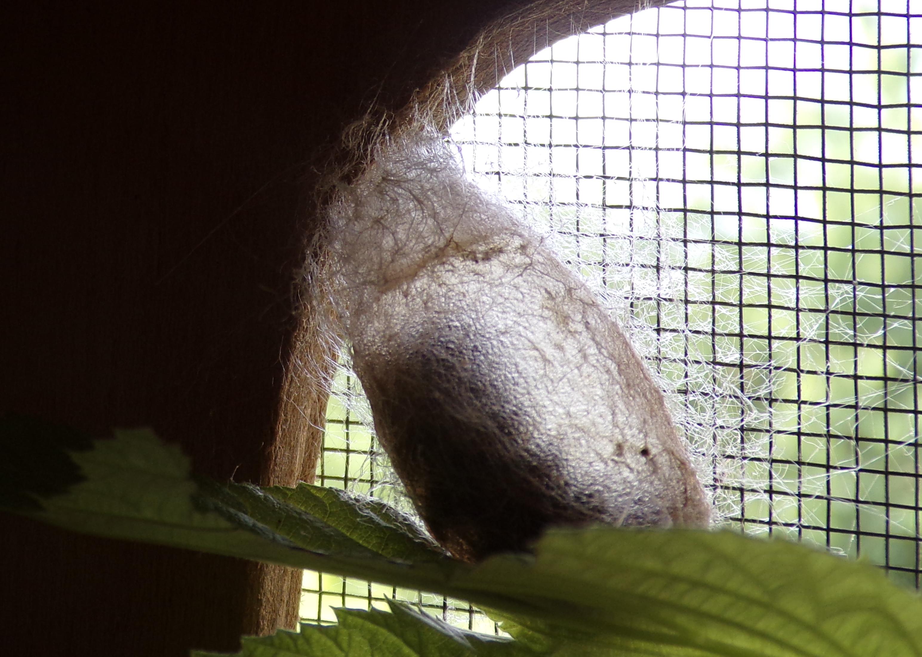-"C’est dans ce cocon que le Petit paon de nuit passe tout l’automne et l’hiver sous forme de chrysalide, pour émerger au printemps
