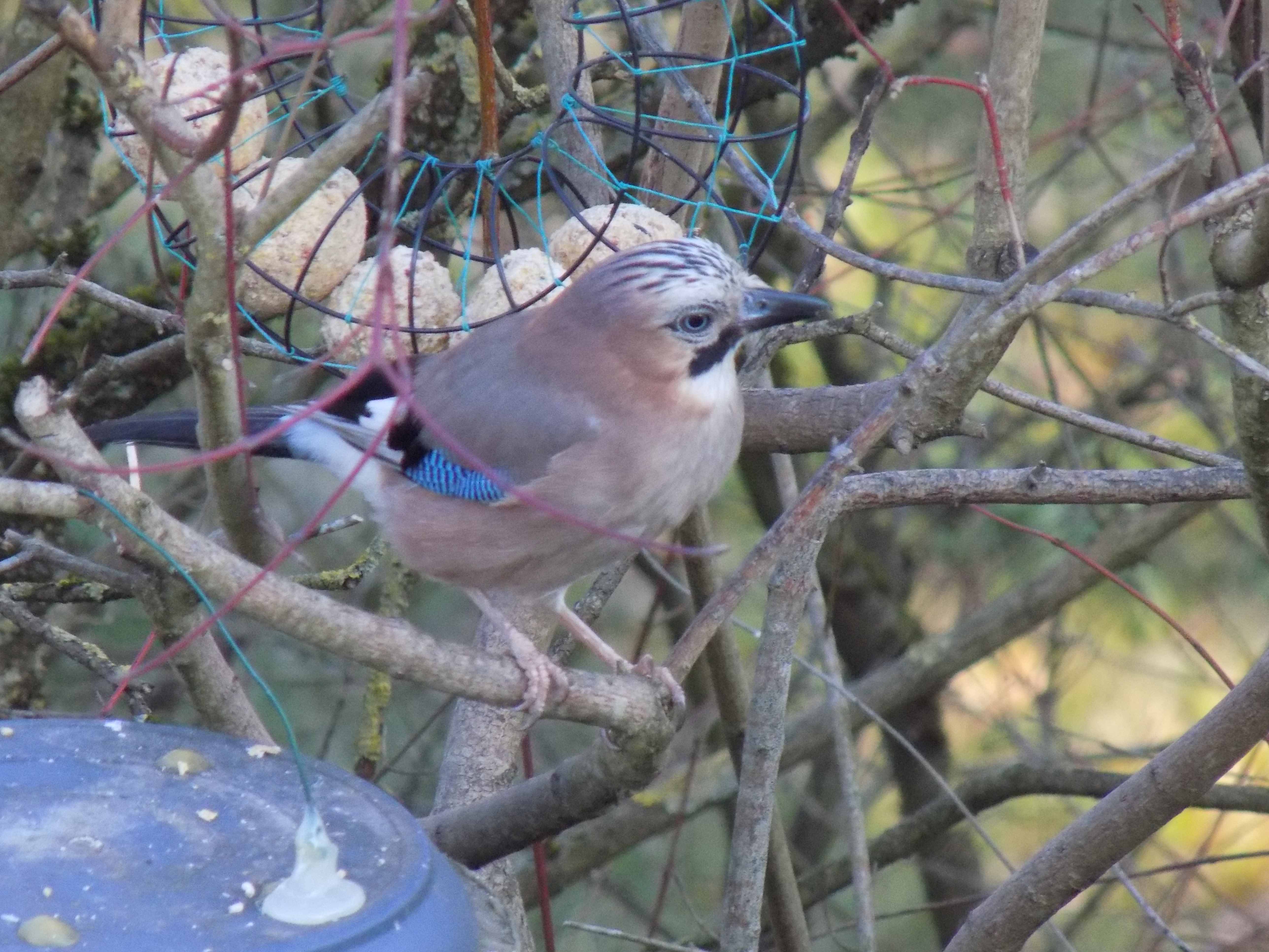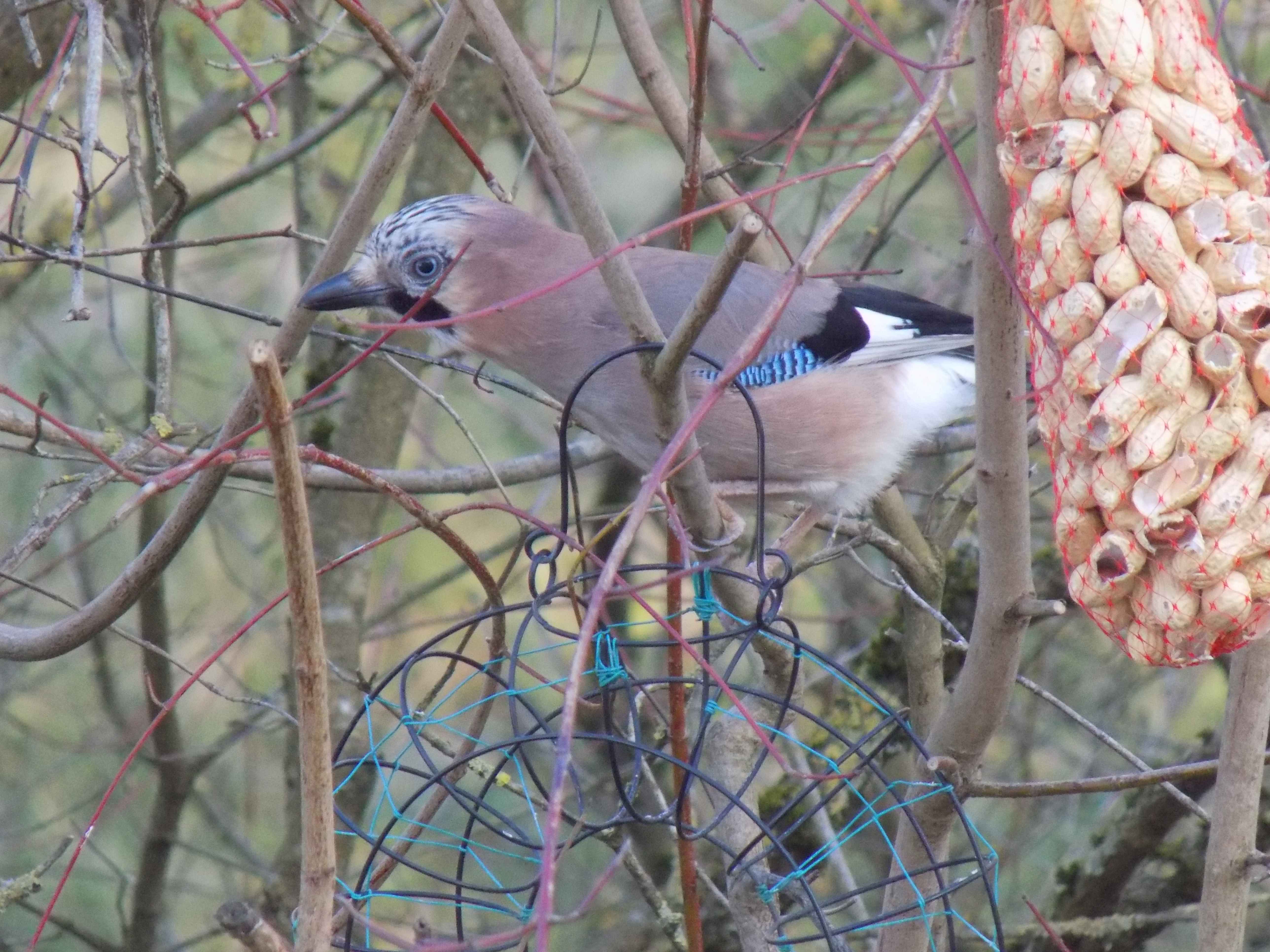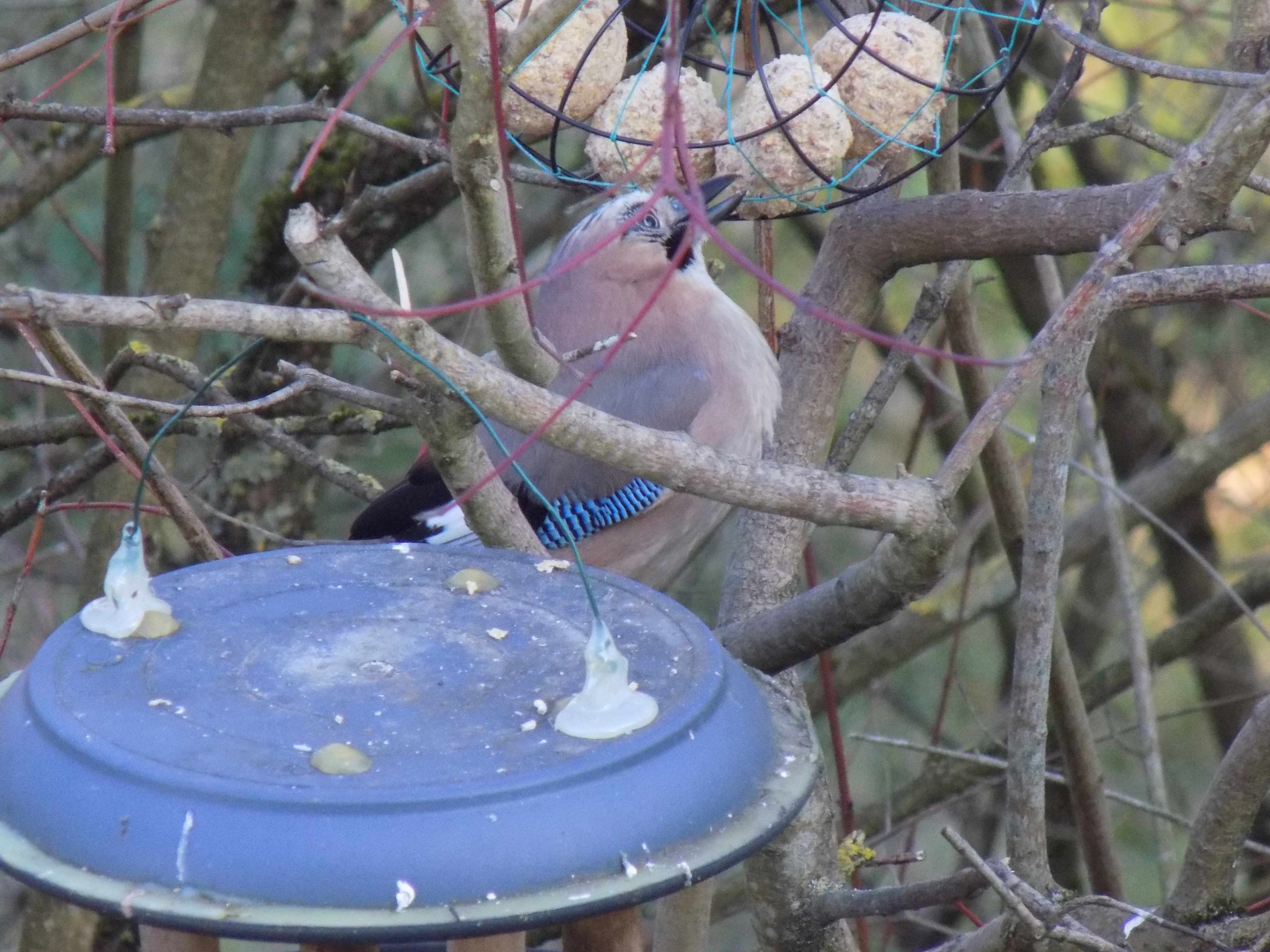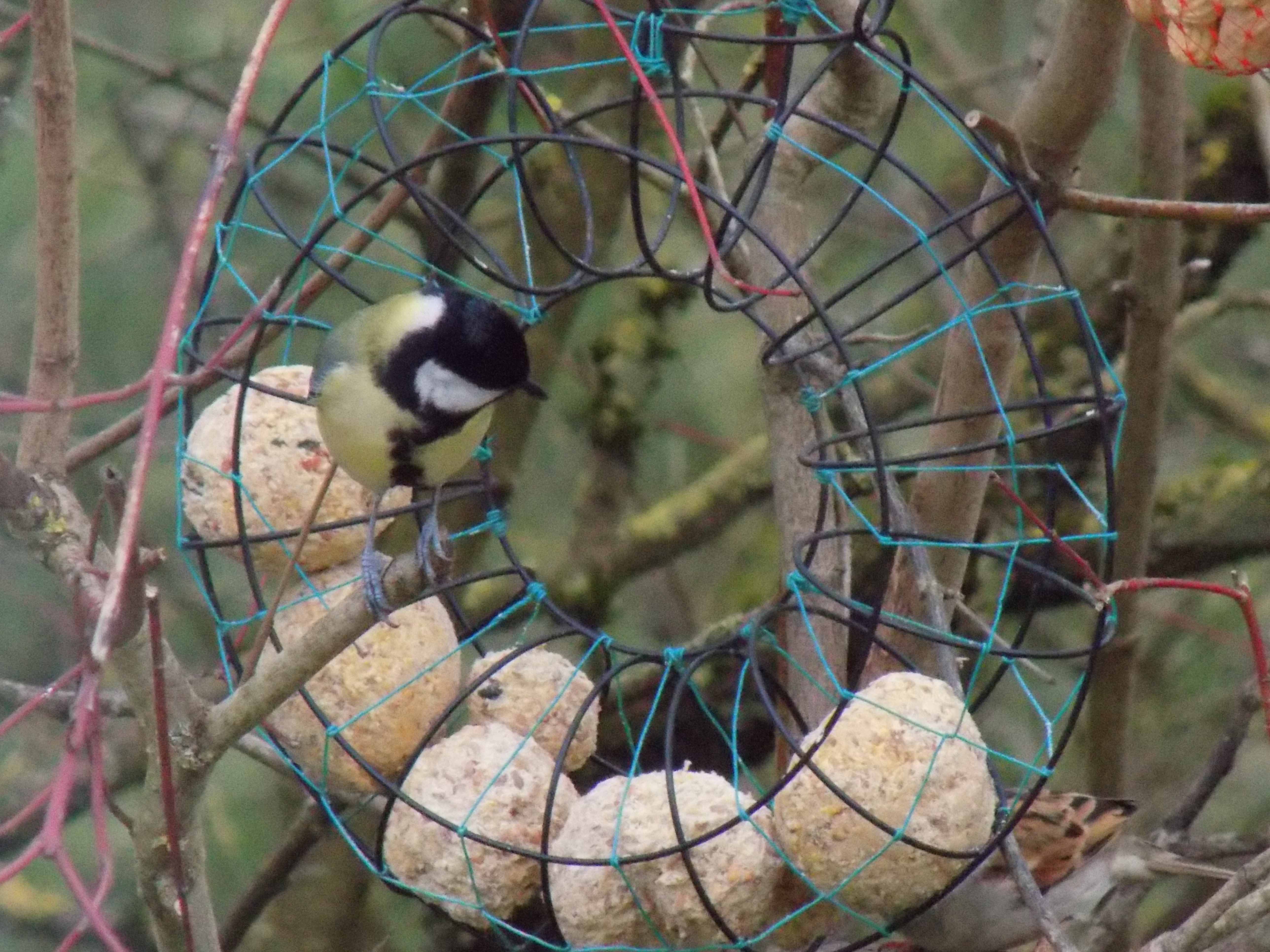 Dans un prunier sauvage j 'ai suspendu 2 mangeoires à boules de graisse ,1 mangeoire ou je met : assortiment de graine , graine de tournesol , vers de farine , miettes de pain et larves de mouches . Il y a aussi un abreuvoir et deux nichoirs .