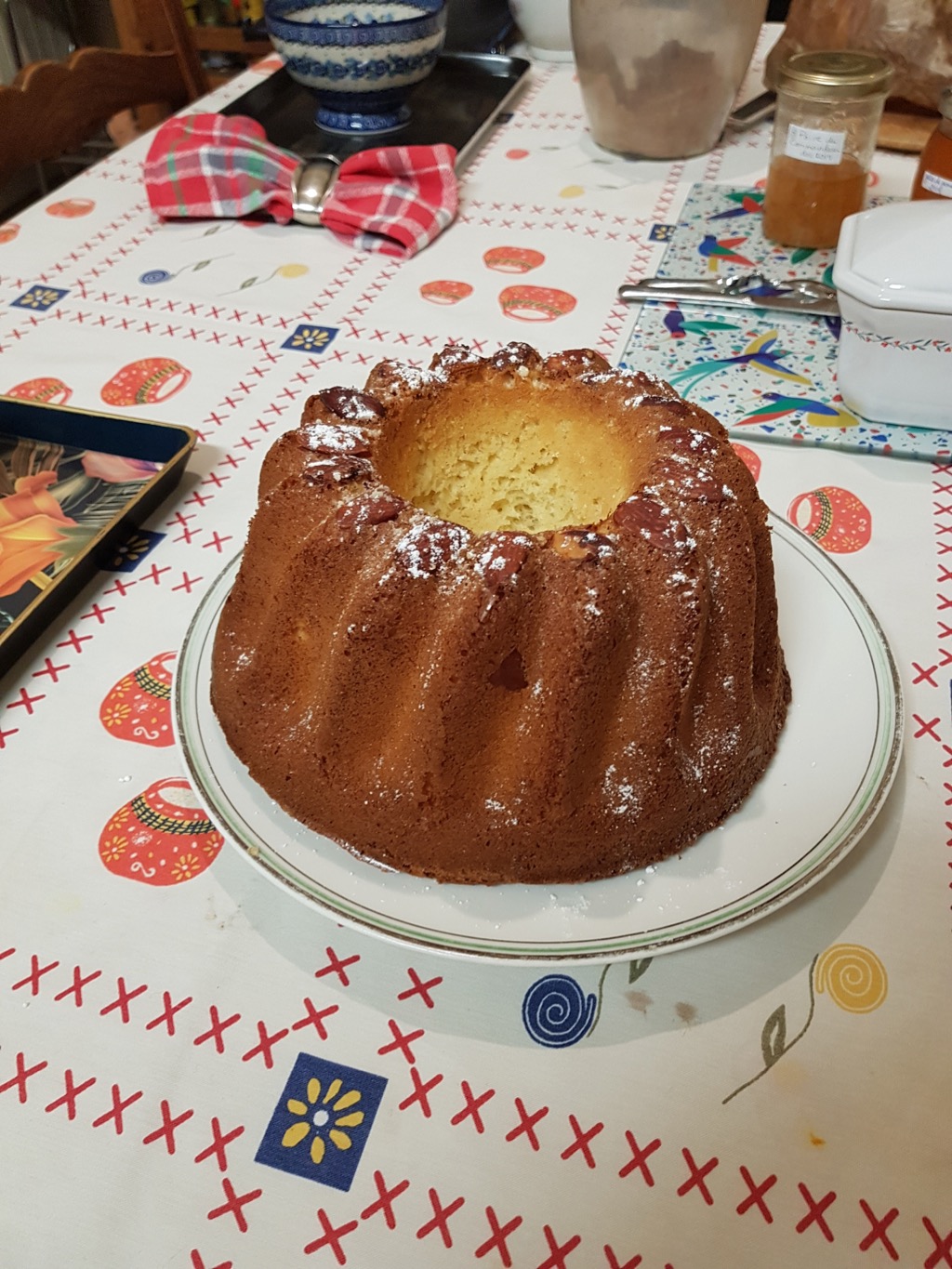 bon réveil aux filles , petit déjeuner prêt avec une belle brioche cuite hier soir par mon mari qui retrouve un peu d'activité
