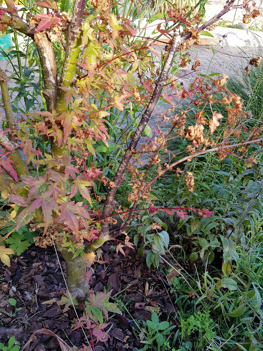 J'ai un soucis avec mon acer ginnala, je ne sais pas s'il a trop souffert de la chaleur cet été ou s'il s'agit d'une maladie, mais ses feuilles présentent des taches brunes/noires comme si elles avaient brûlées et le tronc est couvert de mousse.
