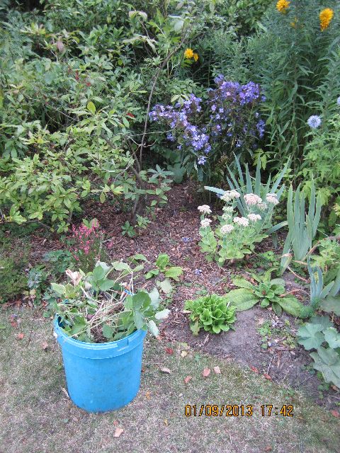 J'ai pu jardiner mais, contrairement à ce que j'avais prévu, j' ai encore laissé tomber le nettoyage pour entreprendre un autre travail : j'ai légèrement modifié l'aspect d'un massif en déplantant (les plantes ont été mises ailleurs) pour mettre à la place les jolis phlox bleus que j'avais reçus il m'a fallu nettoyer les podagraires cachés derrière la plante retirée .. voici le résultat.