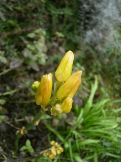 Ce n'est pas 1 mais 2 hampes florales, celle-ci est la plus grande, l'autre fait 10 cm de moins... alors qu'il n'y a plus une feuille, floraison 2011 en retard parce que bloquée par la chaleur et le manque d'eau ou floraison 2012 en avance, je ne sais que penser de cette curiosité...