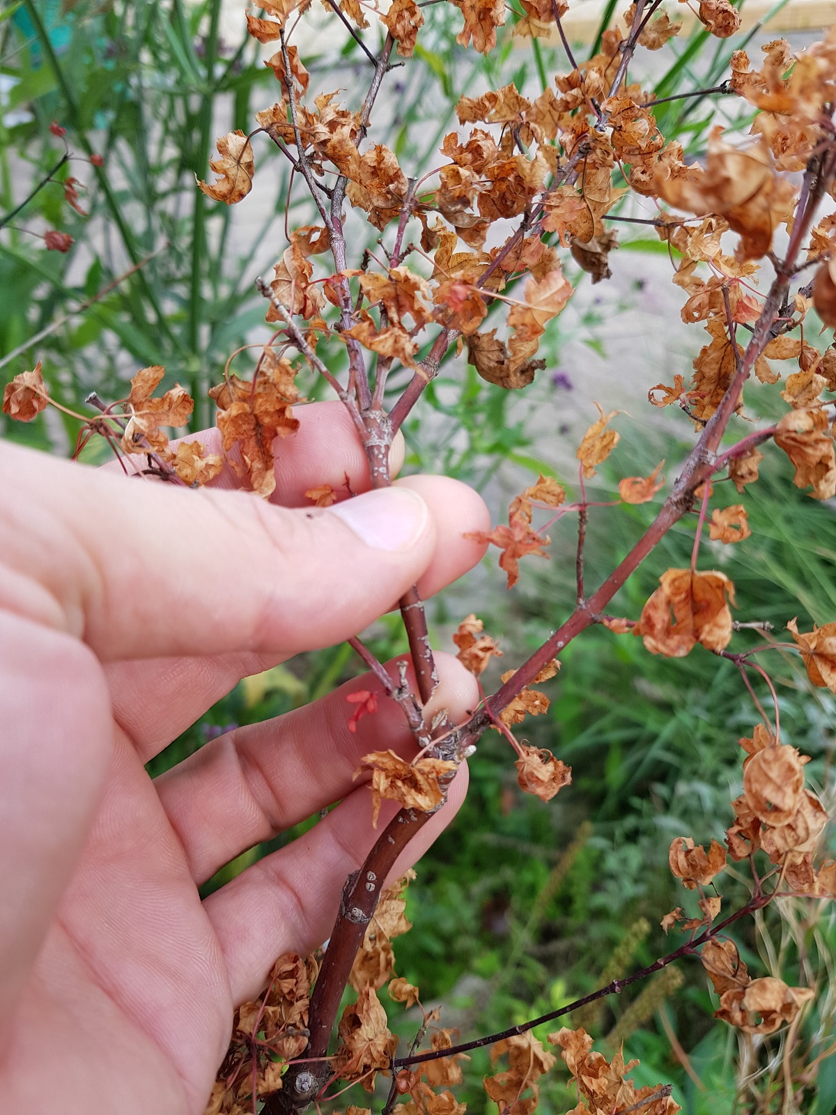 J'ai déjà connu cela sur un atropurpurem. Il a fait une réduction assez forte quand je l'ai planté avant l'été. Le printemps suivant il avait bien démarré et poussé un peu. Et perdu aussi ses feuilles en été sans seconde repousse. J'étais inquiet et un peu désabusé car je le trouvais pas plus grand et étoffé qu'à l'achat.