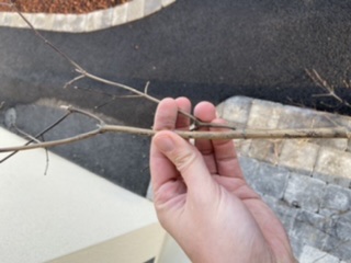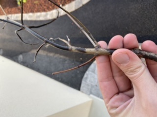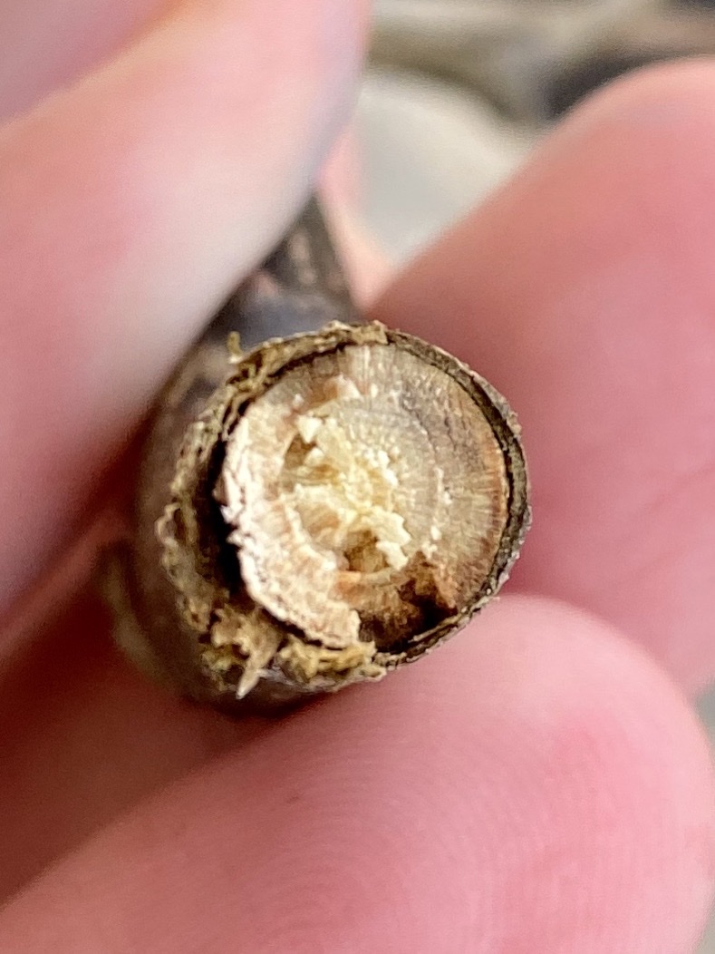 Voilà, j'ai donc fait une coupe d'une branche morte. Je n'ai pas encore eu le courage de couper une grosse. Peut-être ai-je été trop timoré et on ne verra pas grand chose. Bref, j'ai coupé ici :benji791 a écrit : ven. 04 oct. 2019 13:23Hello,opusoculi a écrit : ven. 04 oct. 2019 0:35 Ton deshojo présente des symptômes qui correspondent à ceux de la verticiliose (Verticilium dalhiae); fin d'été, feuilles kraft recroquevillées qui restent attachées, puis les branches qui portent ces feuilles brunissent et meurent, bourgeonnement et repousses sous les atteintes (on les voit au centre sur tes photos). Les branches attaquées son dispersées un peu partout.