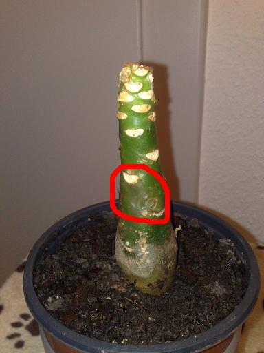 Du coup, le décapité ramollissait encore du haut du tronc qu'il lui reste ... Total : rempotage (encore !) du malade tout seul et découpage de la partie molle, désormais il lui reste moins de 10 cm de tronc ... espérons qu'il reparte, sinon poubelle !