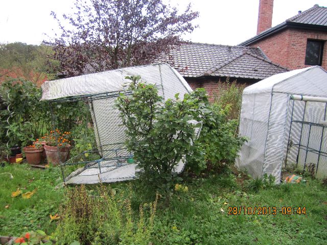 Bonsoir ! la tempête est partie, la tente arrimée avec la brouette a été redressée en attendant de la réinstaller !.. elle a des trous .. à suivre !.on la voit derrière le massif