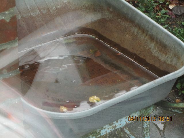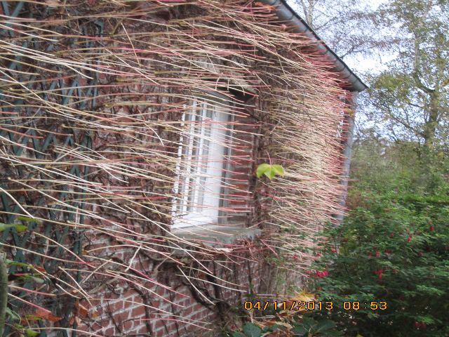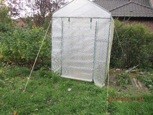 et voici pour finir serre qui avaitdu gîte et ses cordes rompues ! , elle devrait tenir !. .. j'ai ramassé un gros tas de feuilles que j'ai passé pardessus les buis de l'entrée et ai commencé à remplir le massif où sont :1 arum, 1 acanthe et le pied de la clematite armandii?? au moins je n'ai pas à aller loin, cela les protégera ....