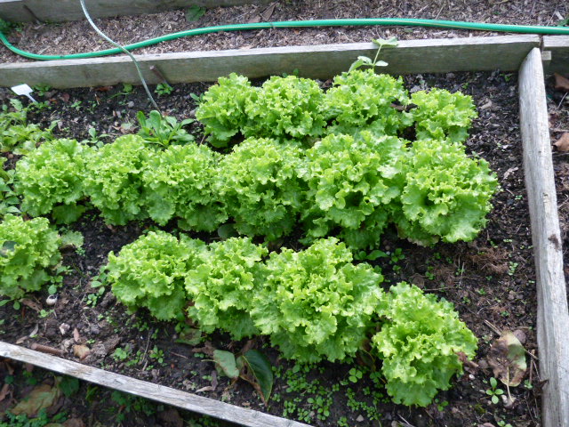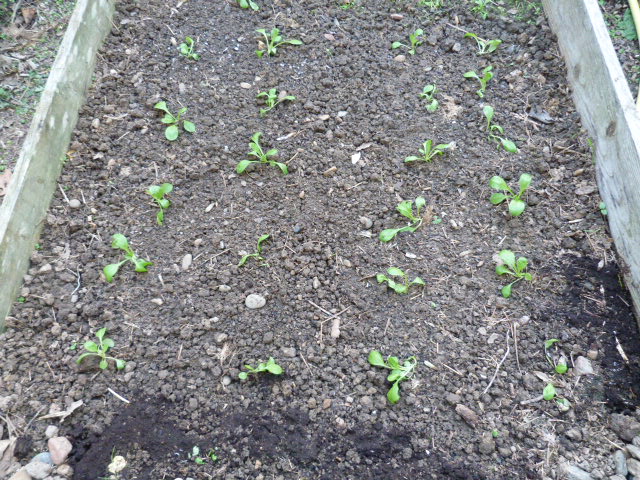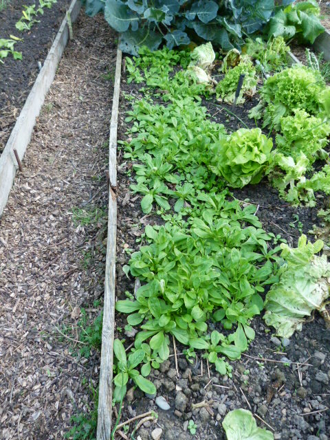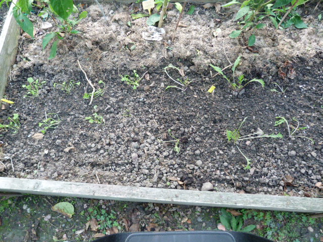 Puis pareil ailleurs, enlevé les piquets de cinq autres tomatiers supprimés la semaine dernière, décompacté la terre et planté 10 mottes de claytone de cuba, 6 de mizuna pourpre et 4 de mizuna vertes. Bien arrosé tout ça...