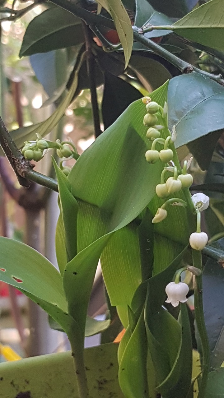 le muguet est aussi en avance quelques clochettes blanches .le lilas de devant la maison n'est pas joli , les grappes de fleurs minuscules . en décembre il refleuri et pris le gel , la neige , la grêle . par contre celui derrière la maison plus protégé , est très fleuri .