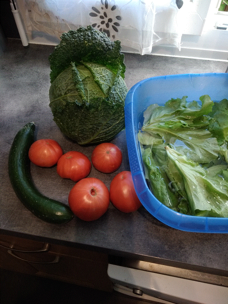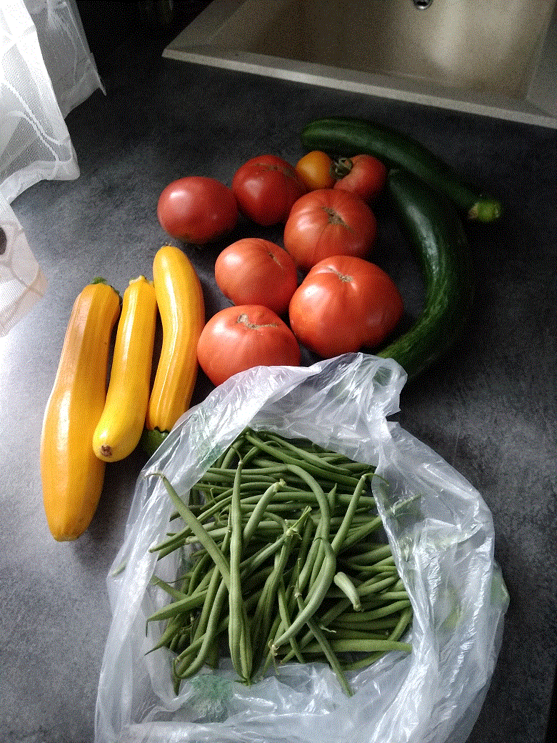 Les récoltes d'hier avec la fin des haricots mais toujours environ 2 concombres par jour.