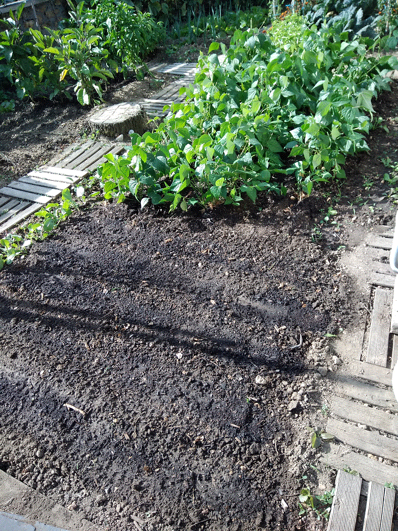 Comme prévu, le tiers des haricots a été arraché et des radis 18 jours ont pris la place. La terre était extrêmement sèche, j'ai arrosé tout le potager.