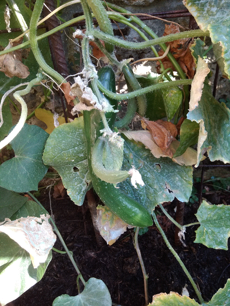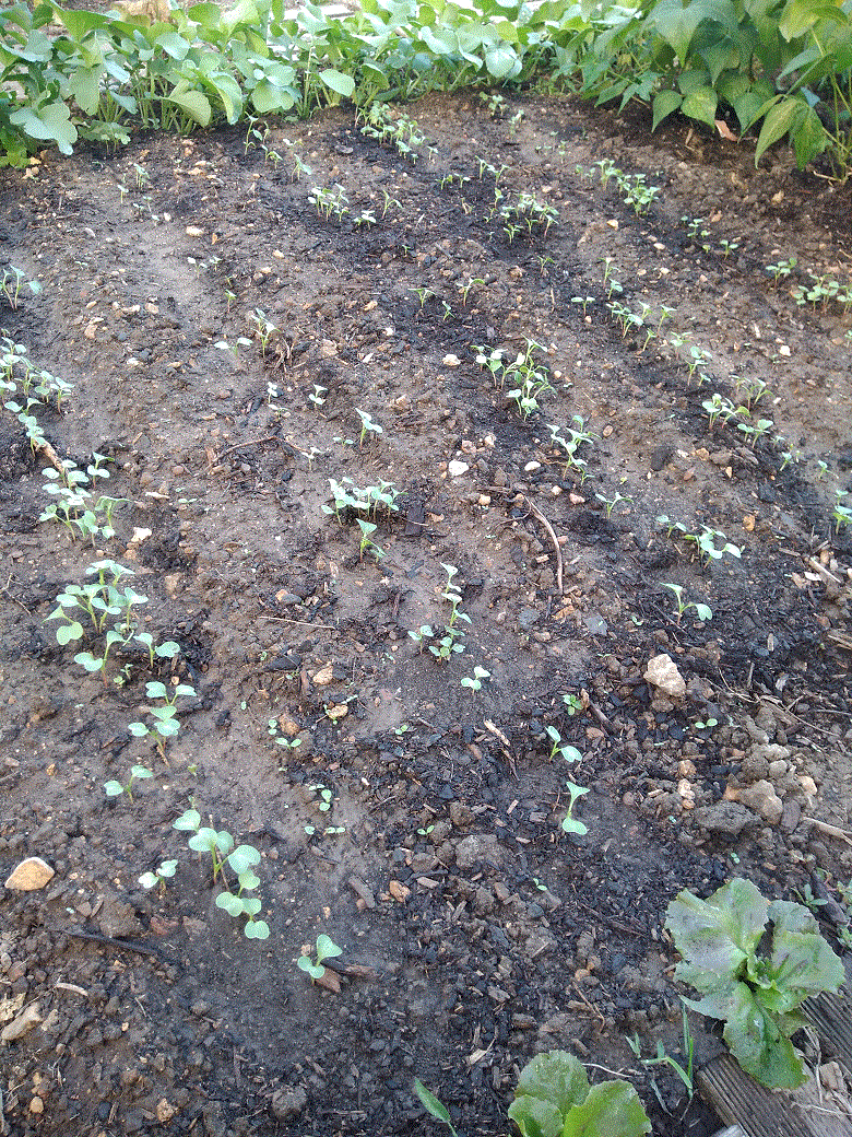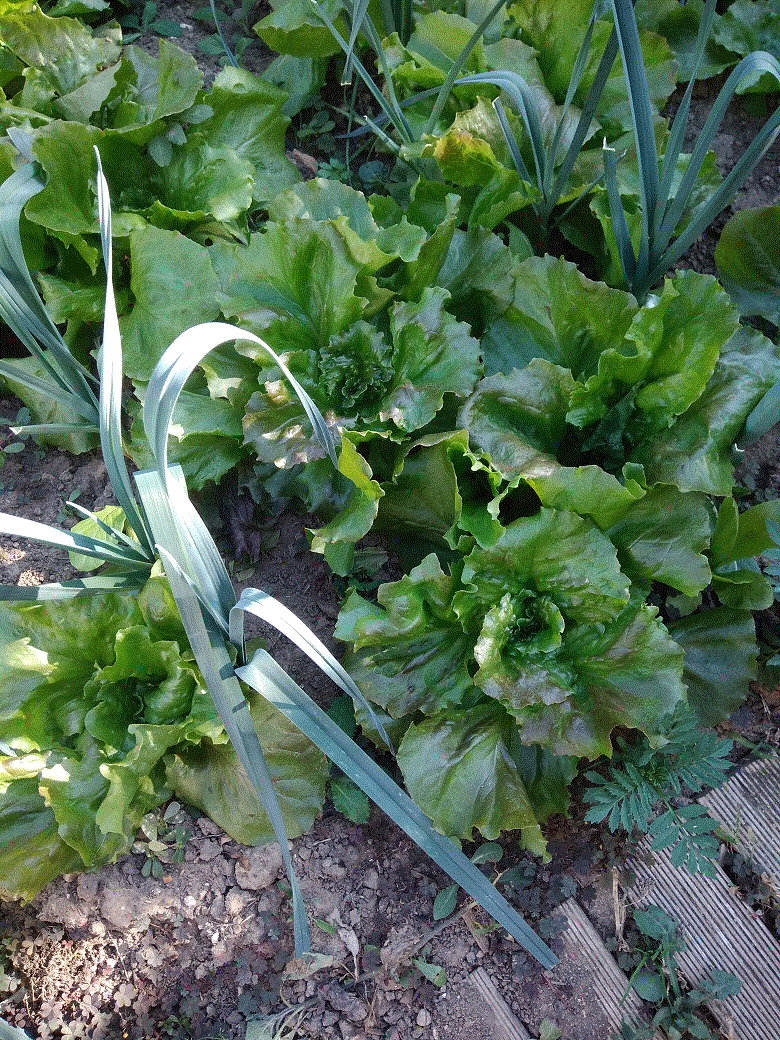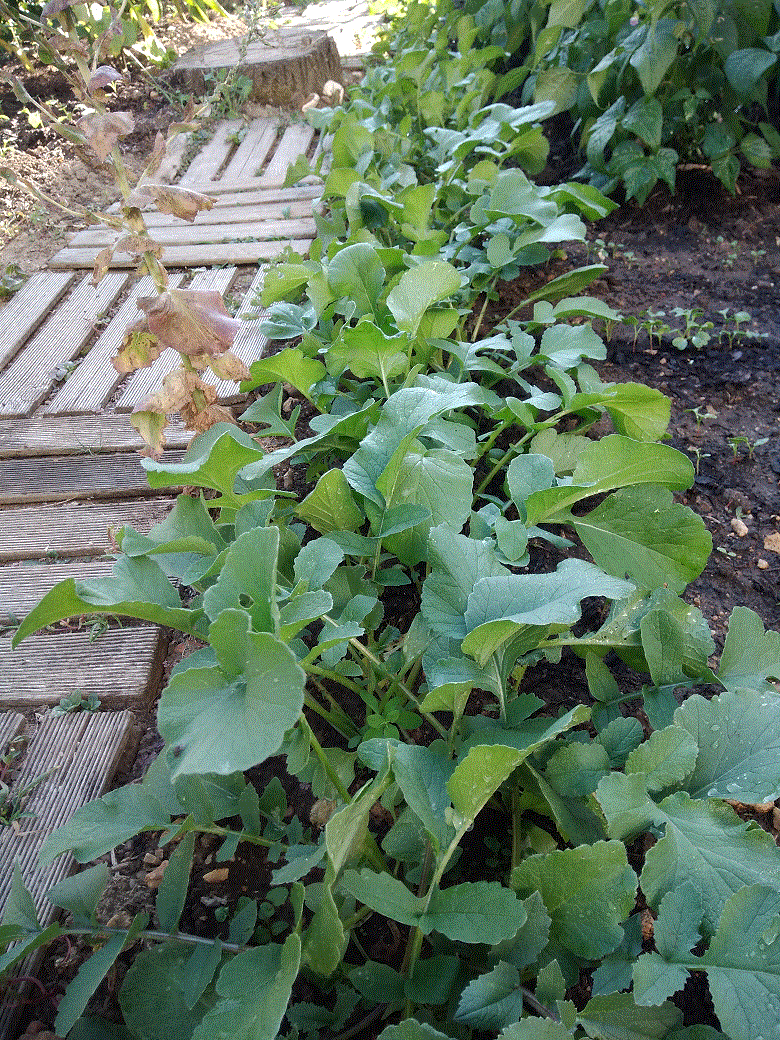 Les concombres commencent à sécher mais produisent encore. Les salades auto-semées commencent à atteindre de belles tailles. La première série de radis noirs pousse tranquillement. Les haricots recommencent à fleurir (merci Jardinière