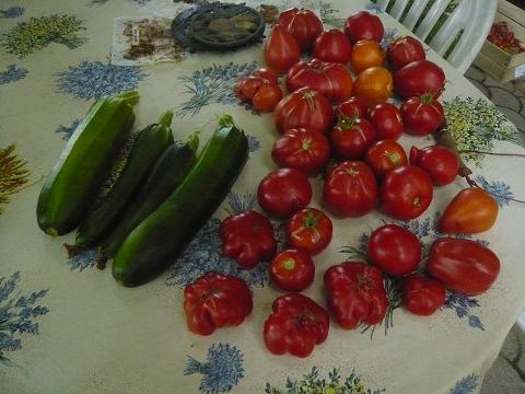 Qq tomates /courgettes/haricots .Au premier plan les haricots sont des crochets de Savoie assez difficiles à récolter car en hauteur!