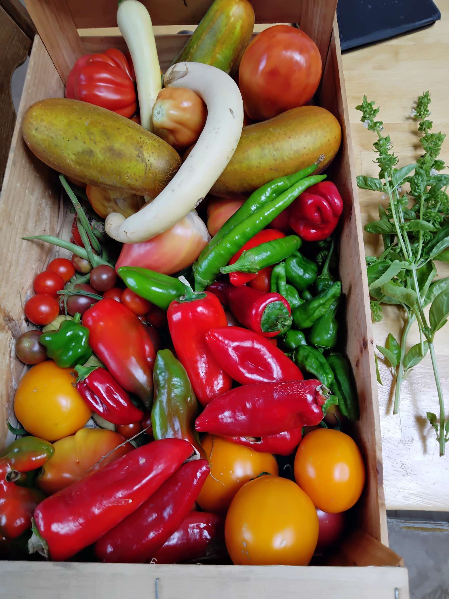 Récoltes: tomates, cornichons, un concombre, pourpier sauvage.