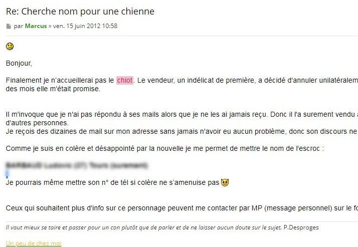 D'ailleurs je profite de cet échange pour rappeler à la prudence toutes les personnes qui passent par internet afin d’acquérir des animaux ou des renseignements sur l'achat d’animaux.