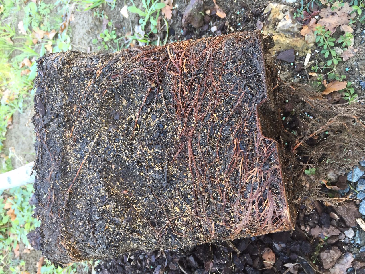 Voici la motte de mon Sango Kaku. on y voit les racines qui sont passées en bas du pot. Le substrat était composé de terreau, d'un peu de petites écorces et de sable avec un peu de petites écorces en fond.