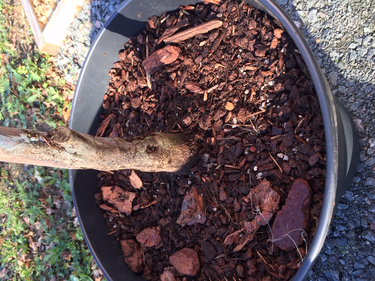 Je l'avais acheté sur un marché aux plantes il y a 2/3 ans et il faisait alors moins d'1 mètre. Je l'avais mis directement en pleine terre chez moi en suivant les conseils du vendeur... Il avait bien poussé jusqu'à son premier automne où il semblait donner des signes de faiblesse.. Je l'avais alors déterré en urgence il y a 1 an (ou 2...) car il avait des branches qui noircissaient. En regardant rapidement sur le net, j'avais lu qu'il fallait couper toutes les branches un peu noire et traiter l'arbre et les coupes à la bouillie bordelaise. De plus, cet arbre avait été planté sans drainage avec de la terre de bruyère pure dans une petite fosse argileuse (merci le vendeur