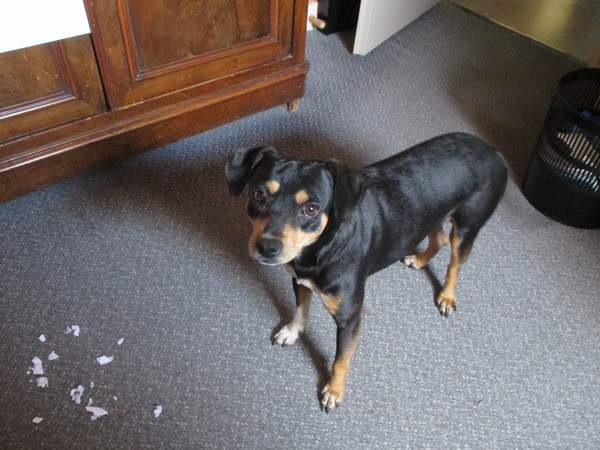 Quant à moune effectivement elle est entrain de parfaire mon dressage au gâtisme , trop mignonne et crapule qu'elle est ; elle ne fait plus de bêtises ,juste un pipi dans le cellier découvert ce matin , au début elle faisait pipi n'importe où , puis la nuit elle me réveillait du bout du nez pour me dire que c'était urgent , maintenant elle fait ses nuits complètes et demande la porte quand je sors du lit ; question pot de colle elle s'y entend , et elle commence à avoir des envies de jouer, vraiment je ne regrette pas de l'avoir adoptée , elle m'occupe et m'apporte toute la tendresse et la gentillesse dont j'avais besoin .Voilà la photo de la coupable qui vient de déchiqueter un papier que j'avais eu la flemme de mettre dans la poubelle juste derrière , je ne sais pourquoi elle est passionnée par le déchiquetage de tout ce qui est mouchoirs , papiers