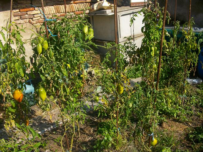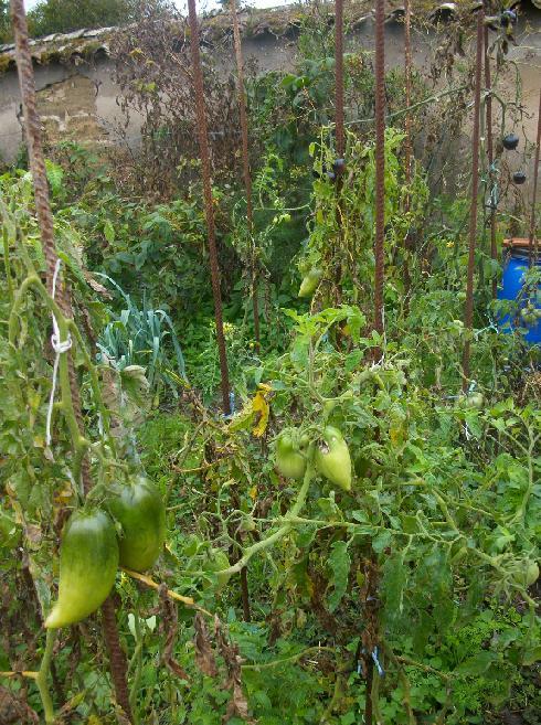 malgré cela je démonte mes tuteurs, jette les derniers plants. Il me faut refaire la fraiseraie . Enterrer le fumier, dans tout le potager, avant l'automne, pendant que le sol est chaud; mettre les poireaux en jauge.Préparer des chassis pour l'hiver. Apporter quelques amendements, répérer les emplacements des cultures 2012. reste un dernier "carré" de dix plants de tomates,attendant la rigueur automnale . ma saison 2011 se termine sur cette image: vous avez tous lu mes précautions pour avoir des semences pures.