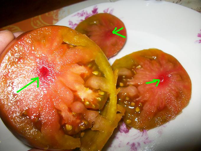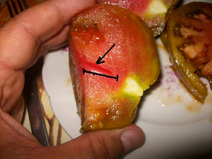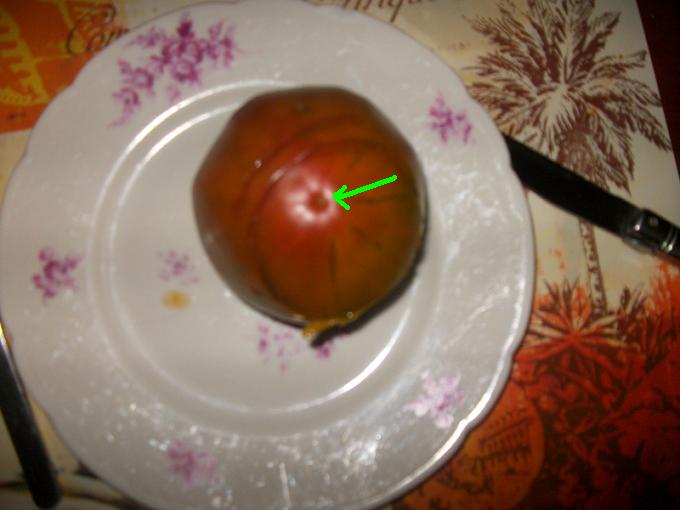 pour parfaire l'exemple, voici une de mes coeurs de boeufs noires, justement ayant eu la visite d'un bourdon!! la "marque" ( je n'ai pas tous les termes techniques