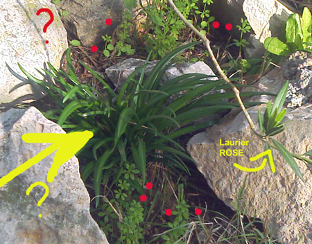 le troisième (flèche jaune) est une plante qui est vigoureuse au point de m'en émouvoir car elle est bien portante et pourtant abandonnée entre ces pierres. Autour d'elle, (les quatrième )de toutes petites plantes pimpantes que je signale par des points rouges.