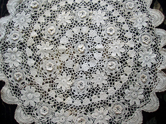 Est-ce ce genre que tu cherches? Dans mon bouquin il y a des coqs avec frises de petits personnages, ou avec des fleurs, des guirlandes de roses juxtaposées, des motifs géométriques type flocon de neige, des entre-deux à incruster dans de la toile, et plein de nappes et napperons que, vu ton savoir-faire, tu es capable d'adapter en rideaux.