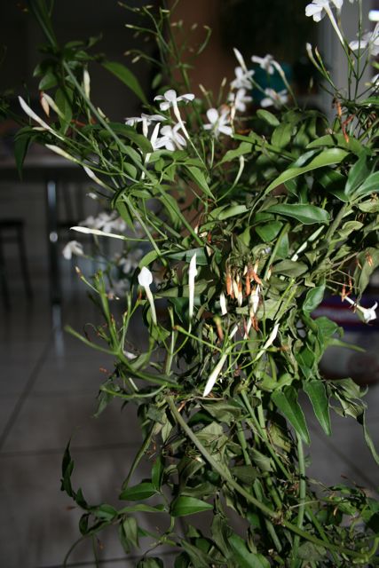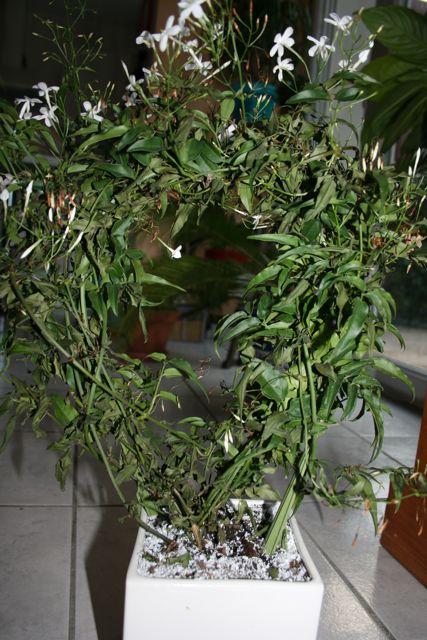 on m'a offert 2 pieds de jasmin blanc en pot à Noël. Je ne sais pas exactement de quelle variété il s'agit mais d'après mes recherches cela semble être le jasmin officinal. Ils ont été achetés chez un fleuriste et sont en fleurs, alors je n'ai pas osé les mettre dehors avec les températures nocturnes proches de 0°C (j'habite dans le pays Basque). Mais depuis quelques jours un des 2 pieds a les feuilles qui sèches et tombent, ainsi que les fleurs et boutons. Je crois qu'il a eu soif car la terre était très sèche quand cela a commencé. Mais depuis je l'arrose beaucoup et régulièrement de façon a garder la terre humide mais le processus semble continuer. ce que je ne comprends pas c'est que l'autre pied a l'air d'aller bien (enfin à part quelques boutons qui sèchent aussi). Je ne sais pas quoi faire...au secours!