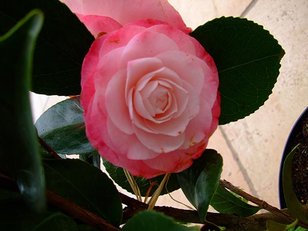 Par contre, en pot, le camélia ne résiste qu'à moins 8. J'ai perdu un camélia avec moins 12. J'étais en vacances et lorsque je suis revenue, c'était trop tard. Cet hiver, il y a eu moins 9 une nuit mais mon nouveau camélia en pot n'a pas souffert. Depuis, je l'ai quand-même couvert par précaution.