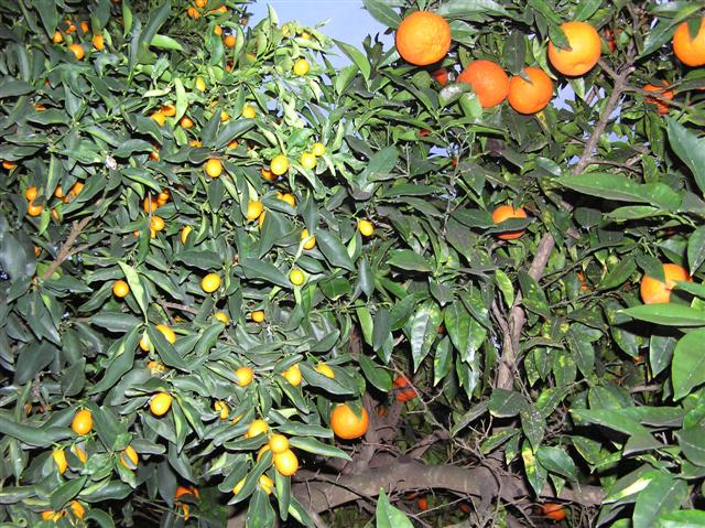Il a planté il y a une vingtaine d'années des orangers, citroniers, etc... et a essayé de greffer sur le même arbre plusieurs variétés. Pour moi qui suis novice, c'est vraiment impressionnant. Place aux photos : c'est un arbre avec oranges amères au départ (d'après ce que j'ai compris, c'est la base de tous les agrumes ?), sur lequel il a greffé du citrus (je n'ai que la photo des fruits, je ne suis pas sûr de la variété ?) puis du kumquat.