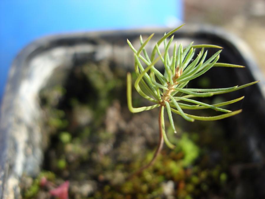 j'ai aussi un bébé pin du même âge -2ans- ,mais il fait 30cm de haut , les aiguilles ont 5cm de long ,celles du bas commencent à vieillir et il a un petit épi terminal; ma plante est beaucoup petite Haut 4cm ,tige diamètre 0.5mm, "ombelle" diam total 2 cm ,elle n'a plus évolué depuis cette époque, sans nouvelle pousse ni épi ni perte ni jaunissement elle supporte autant le sec ,la boue le chaud et le froid!!! mystère......