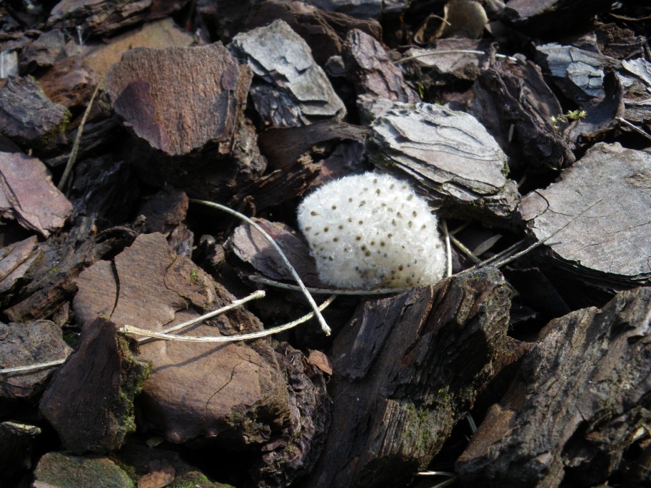 J'ai paillé mes rosiers avec des écorces de pin sur film plastique. En quatre ans je n'avais jamais vu cette chose. Cela fait comme le système du champignon vesse de loup.