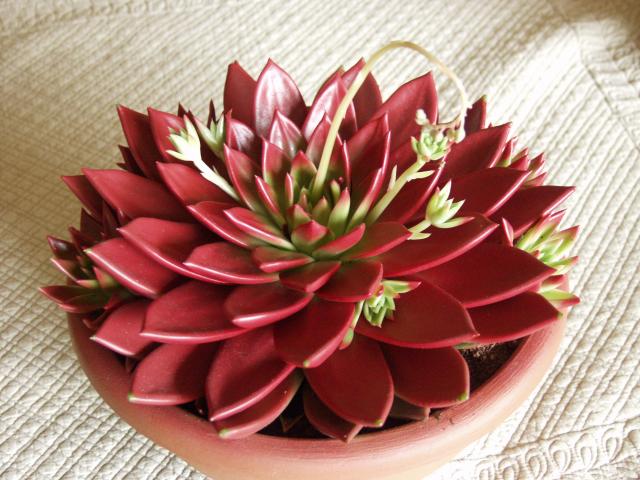 Et il est pétant de santé... n'eût été la couleur rouge prononcée, j'aurais dit Echeveria Black Prince. Mais des pros de succulentes vont sûrement passer dans le coin.