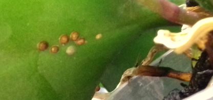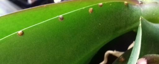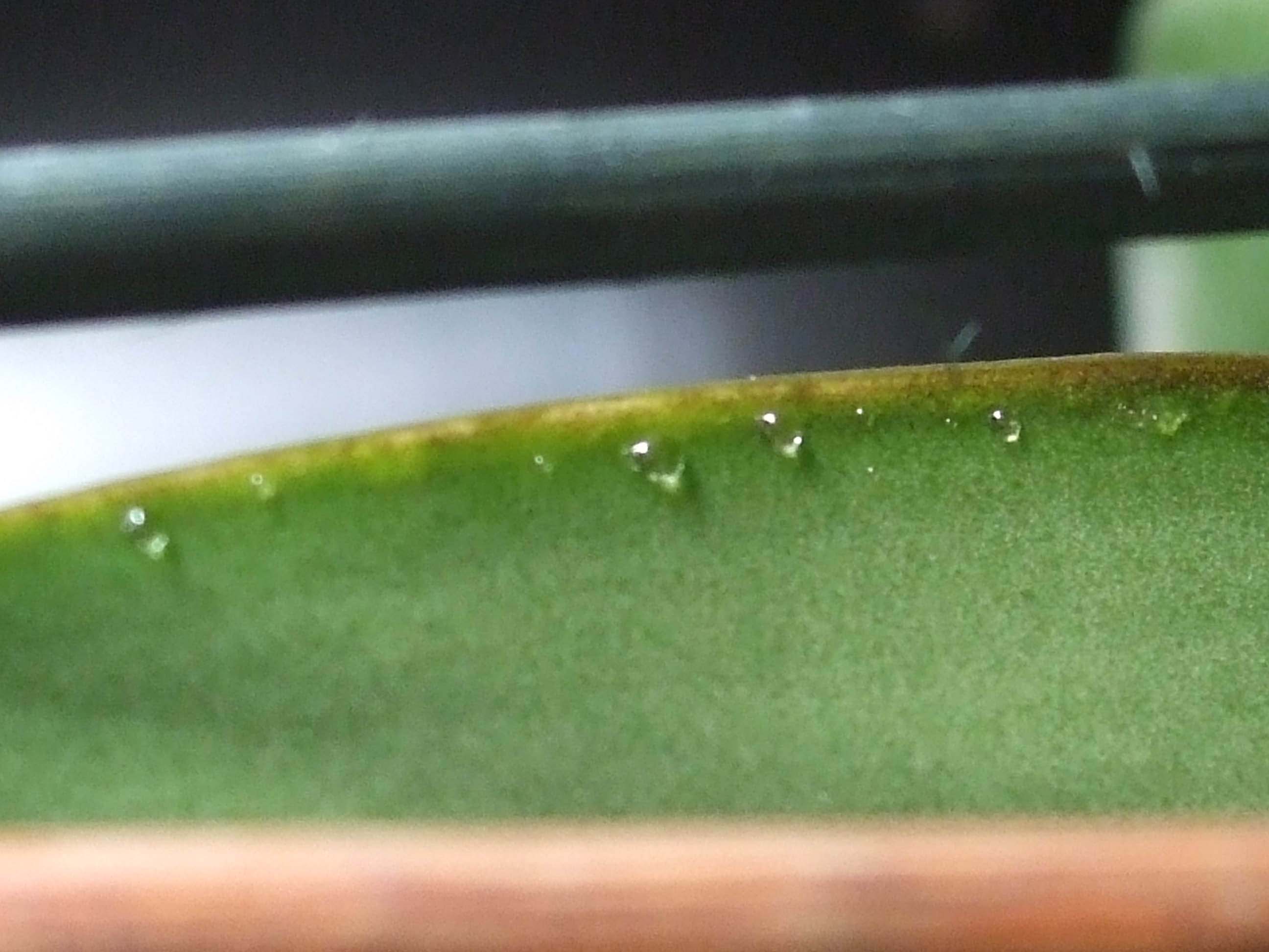 Cela fait quelques semaines que j'ai remarqué des petites gouttes sous une feuille de mon orchidée (Phalaenopsis). Je me suis promenée sur les forums pour identifier le problème mais je ne suis toujours pas sure de ce que cela peut être.