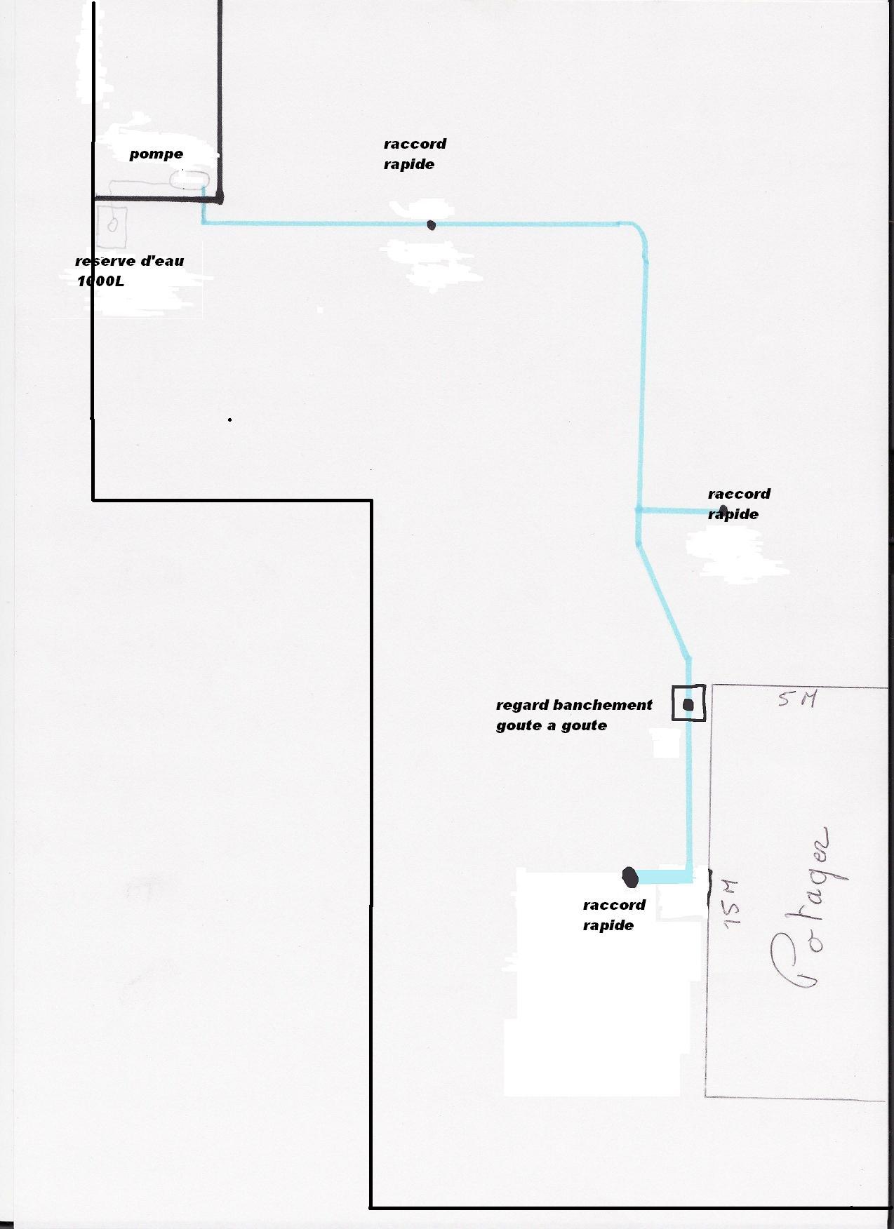 Je souhaite gagner du temps pour l'arrosage de mon potager. Je voudrais réaliser un système d'arrosage du potager goutte a goutte. J’ai une réserve d'eau de pluie de 1000L pour l'instant (si mon système fonctionne j'envisage de raccordé 2 autres réservoirs de 1000L a coté de celui qui est déjà présent ce qui me fera 3000L de réserve) collé au mur du garage juste derrière ce trouvera le suppresseur. J’ai enterré 50M de tuyau diamètre 25 de l'emplacement du suppresseur j'usqu'au pied du potager avec sur le parcours 2 raccord rapide pour arroser le reste (haie, arbres et divers plantes) a l'aide d'un tuyau d'arrosage ordinaire que je brancherais sur les raccords rapide en soirée, l'arrosage automatique du potager (75 m2) ce fera la nuit grâce a un programmateur a piles et sera donc a ce moment le seul réseau en fonctionnement.
