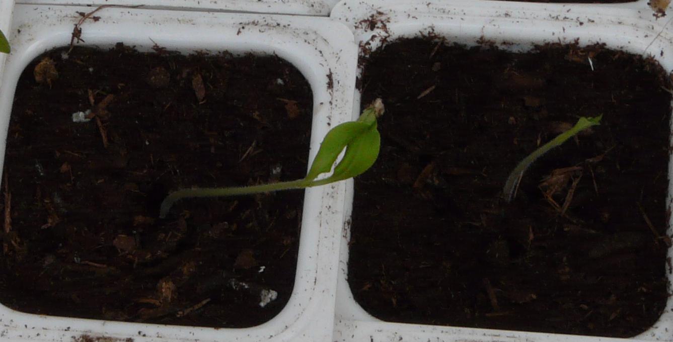 , qui tombe à pique, puisque l'on voit très bien la différence de croissance: sans cotylédons, à gauche plus haute , que celle de droite.