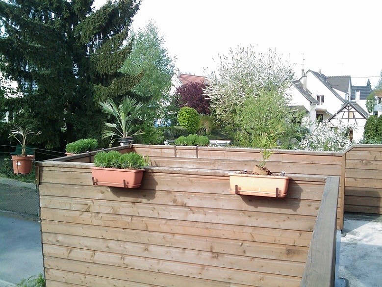 Pour le moment vive l'alsace il pleut en continue depuis 3 jours... (remboursement d'un weekend de pâques ensoleillé...) J'ai du en urgence percer le trou du milieu des jardinières de lavandes par crainte que l'eau de s'aglutine trop vue que le terreau que j'ai utilisié n'est pas particulièrement bien drainé... (pour info ce fut le parcours du combattant car sans dépoter les lavandes, armé uniquemlent d'un couteau et d'un tourne vis ile a fallu percer ce trou à deux, l'un qui tenait fermement la jardinière sur la table de jardin et l'autre sous la table à percer le plastique à travers le trou du parasol... bref en fin de compte ça à marché...^^)