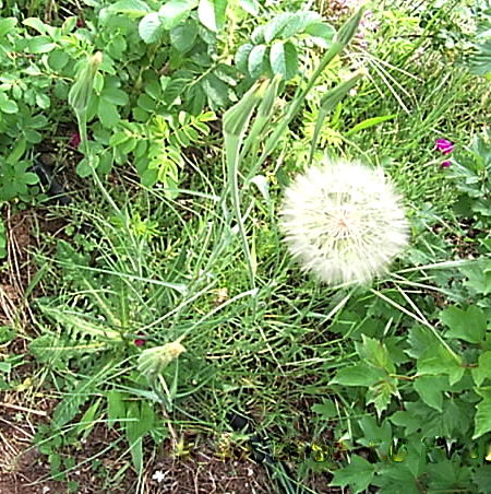 On voit une rosette de crepis (ou espèce voisine) au sol, mais aucune plante ne pouvant avoir à la fois les feuilles longues et lancéolées des salsifis et la rosettes de feuilles larges et dentées des crepis, je pense que les deux plantes poussent au même endroit mais sont distinctes.
