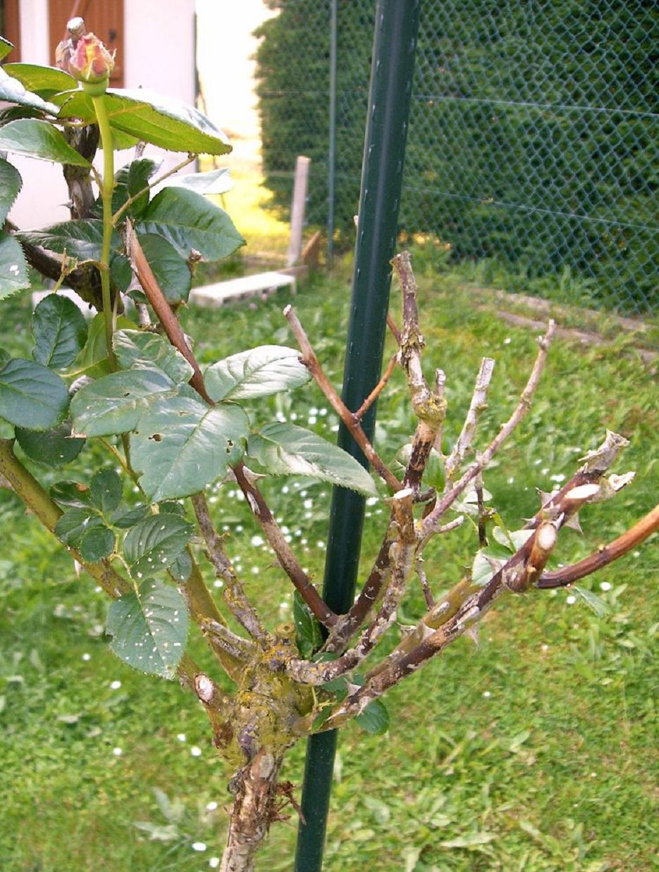 Mon rosier tige de 2 ans qui etait pas trop mal (pas trés fournit), cette anné me fait des frayeurs, il a été taillé, malgré tout certaine branches sont morte et seiches, il ne donne que d'un côté, il à été traité pour les taches noires.