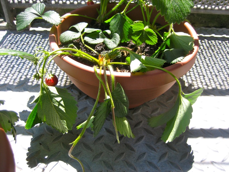 J'ai sur mon balcon 2 pots avec dans chacun 3 pieds de fraisiers (variété "mara des bois"). Je les ai acheté il y a un mois et demi environ, ils donnent déjà des fraises. Tout allait plutôt bien jusqu'à hier où 2 pieds d'un pot se sont flétris... Le 3e semble aller très bien pour le moment... Je vous ai joint 2 photos.