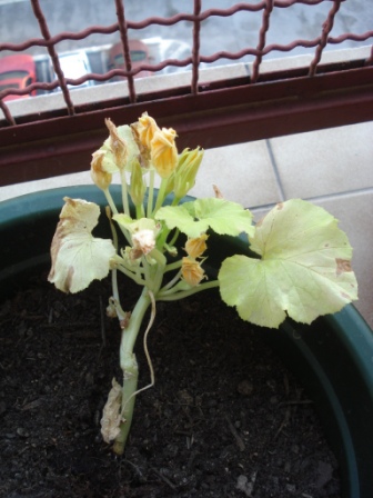 J'ai acheté il y a environ 2 mois un plant de courgette de Nice que j'ai installé dans un pot sur mon balcon (environ 35cm de diametre et 30 cm de profondeur).