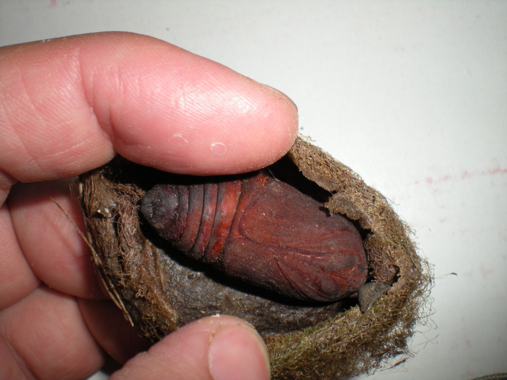 cette énorme chrysalide encore ds son cocon est sans doute celle d'un Bombyx ou d'un grand Saturnidé ( trés grands papillons de nuit, par exemple le grand paon de nuit); remet le où tu l'a trouvé!!! tu auras peut-être la chance un soir d'été d'apercevoir cette merveille!